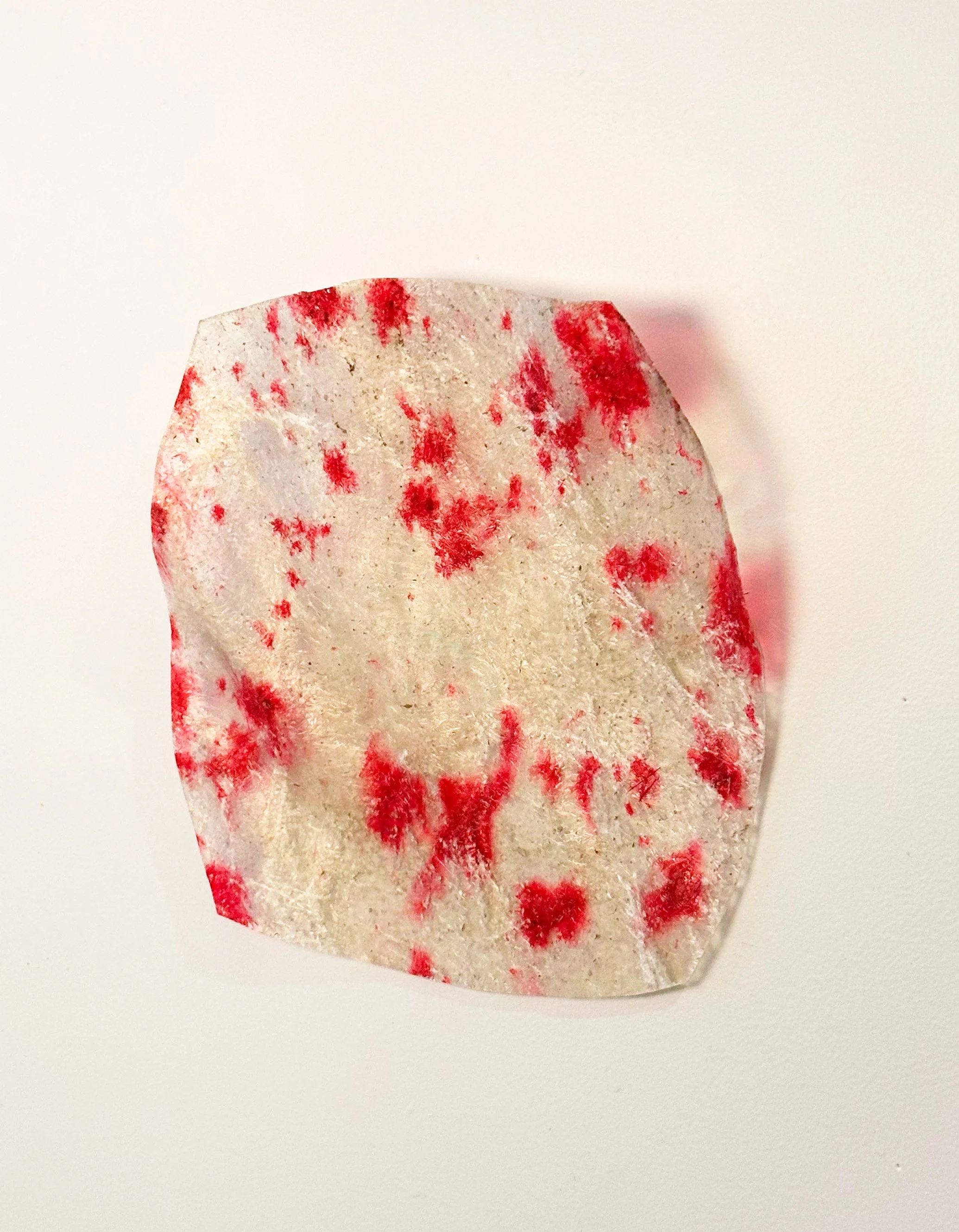 Through precise drying techniques and scaled-down forms, each piece captures the raw essence of material experimentation. Rather than saturating the surface, red appears in subtle drops and traces, emphasizing contrast and depth. The result is a collection that feels both restrained and expressive, where translucency and pigment interact in a quiet yet powerful dialogue.